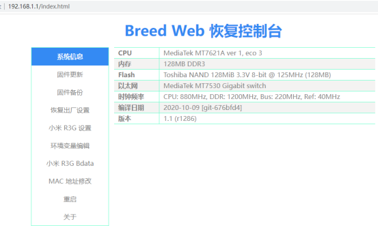 通过浏览器访问 192.168.1.1,进入 breed boot 界面