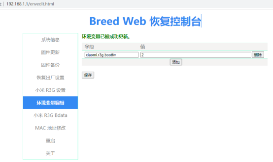 由于 breed 默认不能启动 openwrt 固件,需要设置一个环境变量