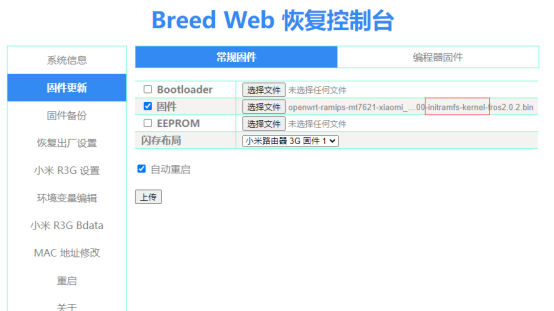 备注:带 initramfs-kernel 字样的固件表示文件系统只读,在 breed 下只能先升级该文件才能成功,当升级成功后进入系统界面再次升级 sysupgrade 固件。